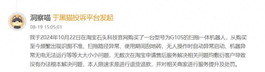 DoNews9月4日消息,8月19日,有消费者在黑猫平台投诉称,自己于2024年10月22日在在电商平台购买了一台石头科技型号为G10S的扫拖一体机器人,从购买至今频繁出现识图不准、扫拖路径异常、使用期间刮地砖、无人操作时自动异常启动、机器异常无电无法运行等等大大小小问题网上配资网,无数次申请售后服务解决相关问题,然而售后均敷衍客户,导致没有办法根本解决问题,现在消费者本人要求进行退货退款,并对相关商家进行服务提升及处罚。