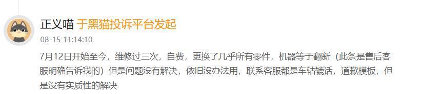 8月15日,有消费者在黑猫平台投诉称,自己花4396元购买了一台石头科技扫地机器人,7月12日开始至今已经维修过三次,都是自费,更换了几乎所有零件,机器等于翻新(是售后客服明确告诉消费者的),但是问题没有解决,产品依旧没办法用,联系客服都是车轱辘话,道歉模板,没有实质性的解决任何的问题。