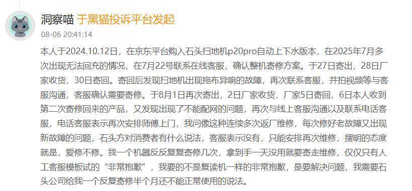 8月6日,有消费者在黑猫平台投诉称,自己于2024年10月12日,在电商平台购入石头扫地机P20 Pro自动上下水版本,在2025年7月多次出现无法回充的情况,在7月22号联系在线客服,确认整机寄修方案。